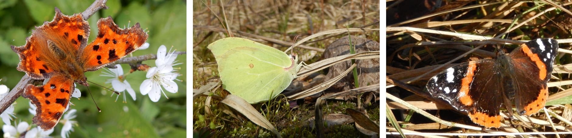 Drie vlinders die vooral in takkenhopen en groenblijvende struiken overwinteren, v.l.n.r.: gehakkelde aurelia, citroenvlinder en atalanta (Bron: Kars Veling)