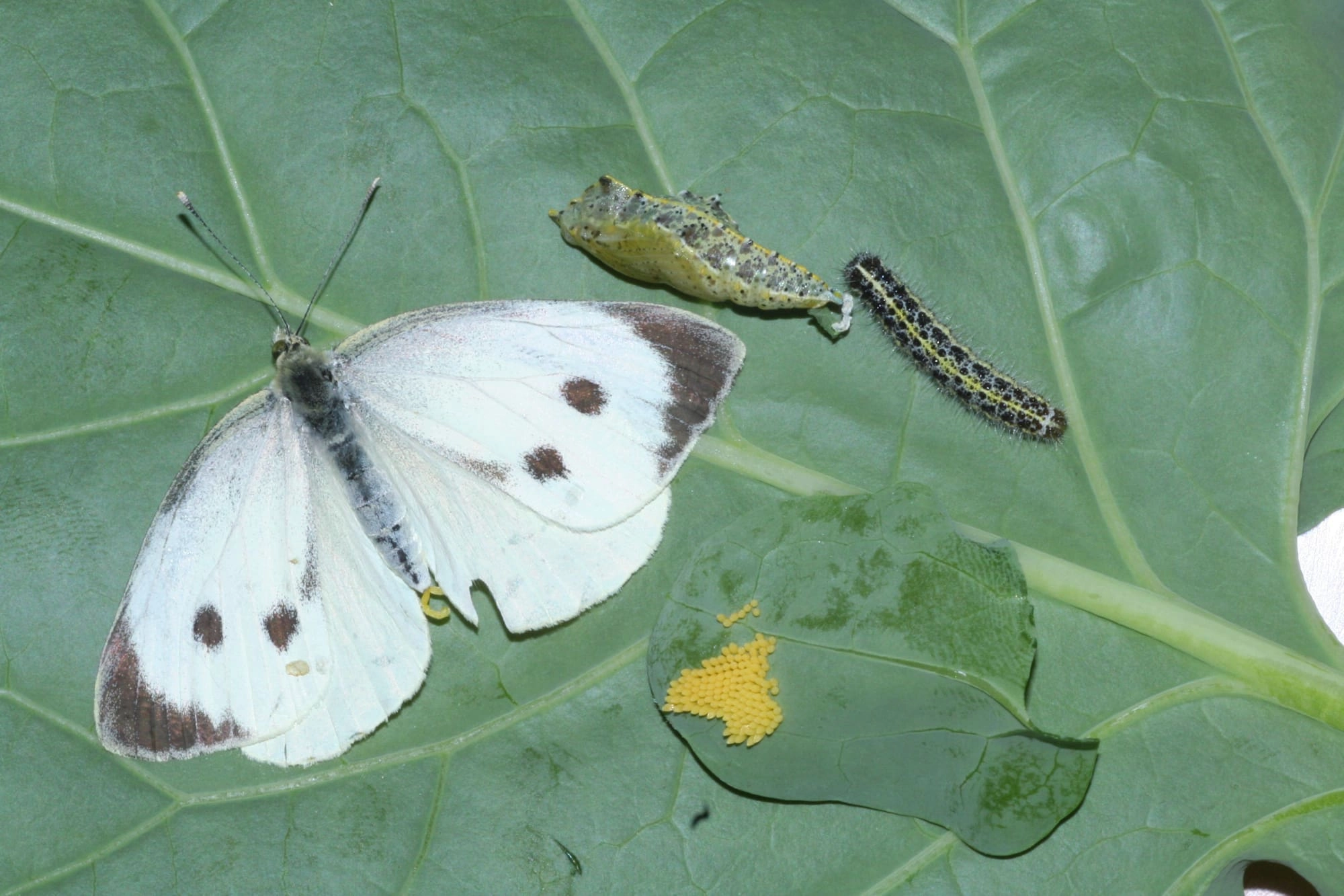 Een Koolwitjespakket bevat levend materiaal met +/- 20 eitjes, 10 rupsen en 5 poppen.