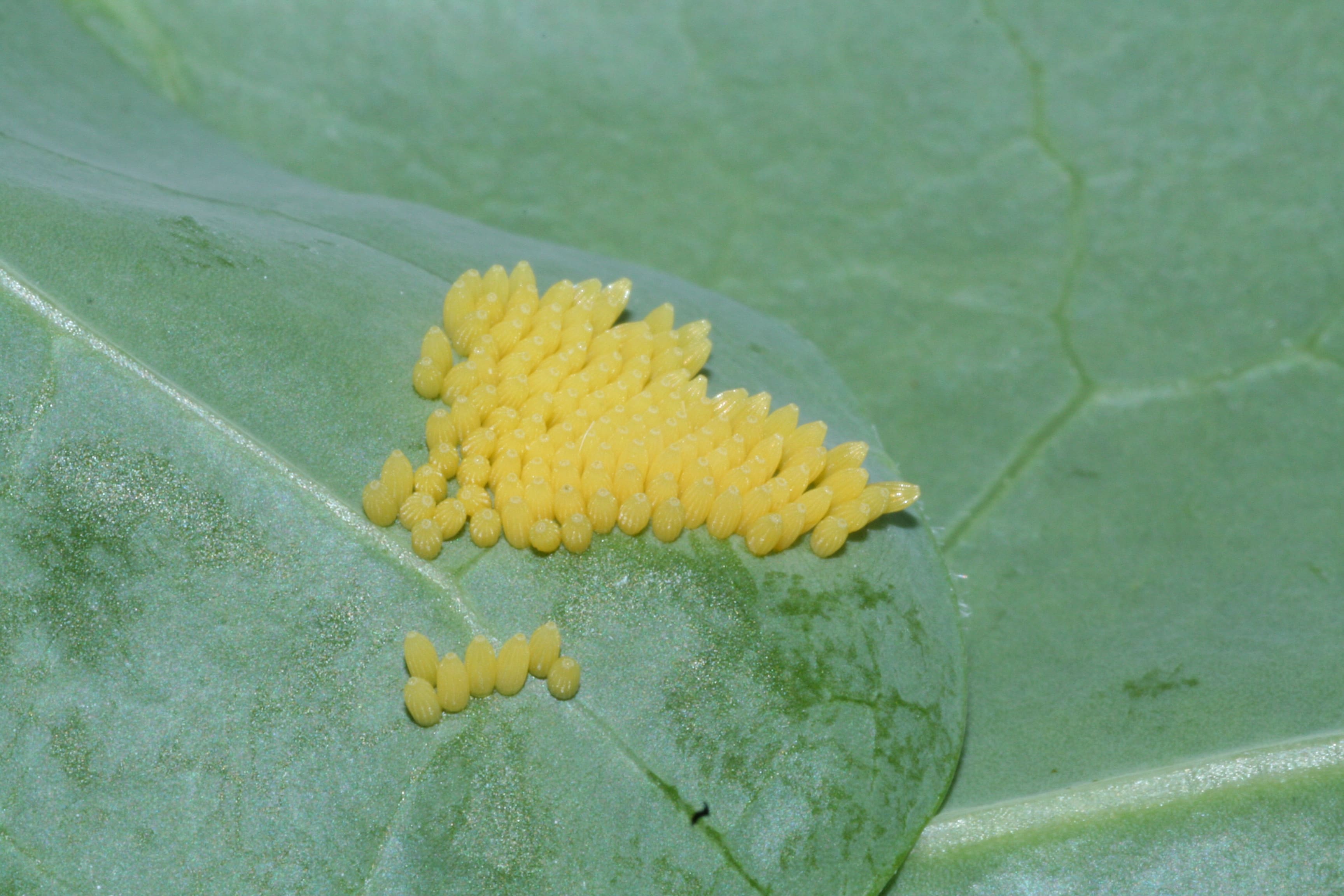 De eitjes vind je in het petrischaaltje bij de poppen. Ze zitten als een kluitje gele bolletjes op een stukje (biologisch) koolblad. Leg dit koolblad, met de eitjes naar boven, op een vers koolblad. De rupsen die uit de eitjes kruipen, kunnen dan meteen het verse koolblad gaan eten.