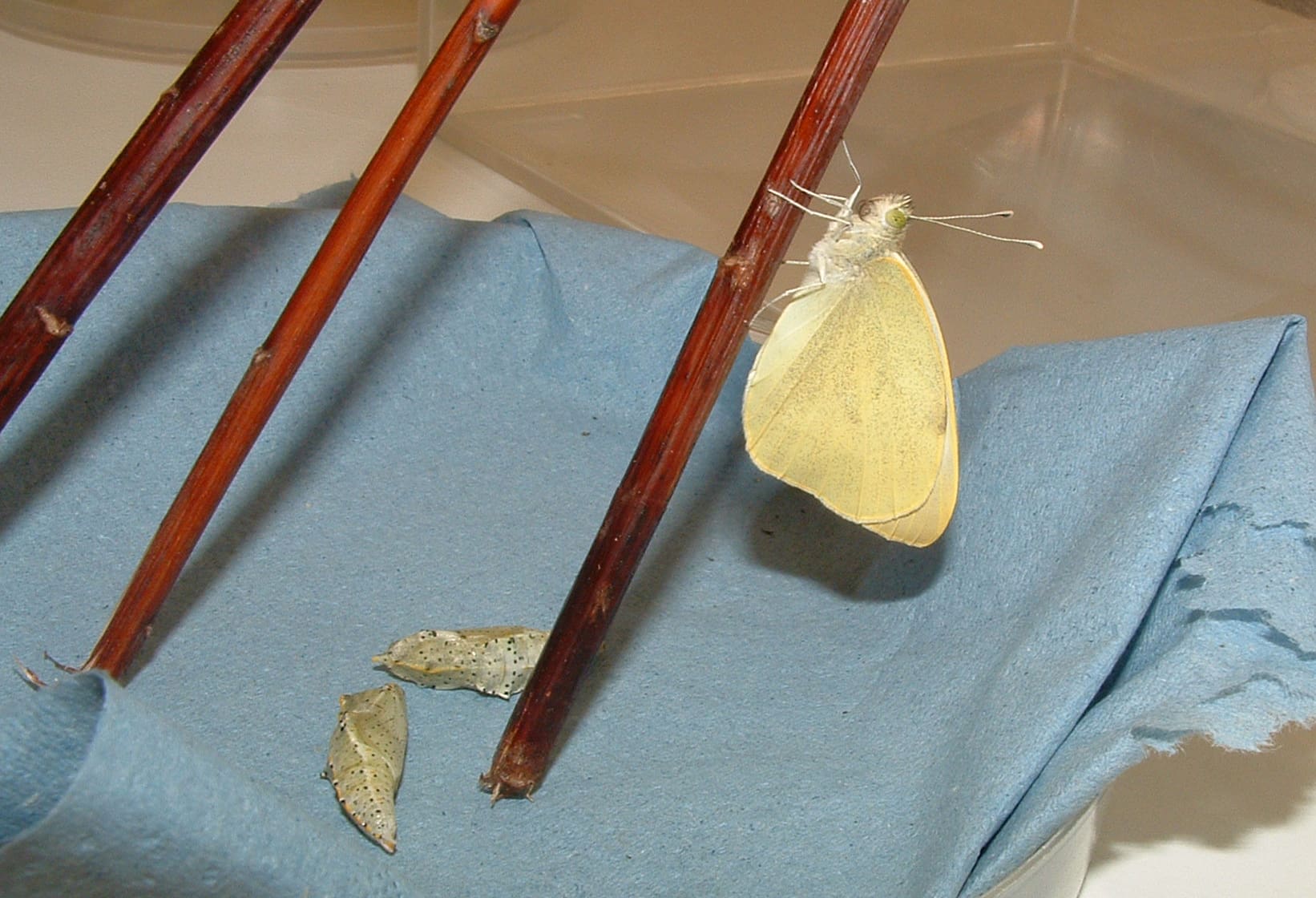De poppen uit het pakket dat je toegestuurd krijgt kunt je in de kooi leggen. Dat kan bijvoorbeeld op een dekseltje, waarin een stukje keukenpapier ligt. Zet ook een takje in het dekseltje, tegen de rand van de kooi omhoog. De vlinders die uit de pop kruipen, hebben namelijk nog natte en opgevouwen vleugels. Ze moeten langs het takje omhoog kruipen om hun vleugels op te pompen en te laten drogen.