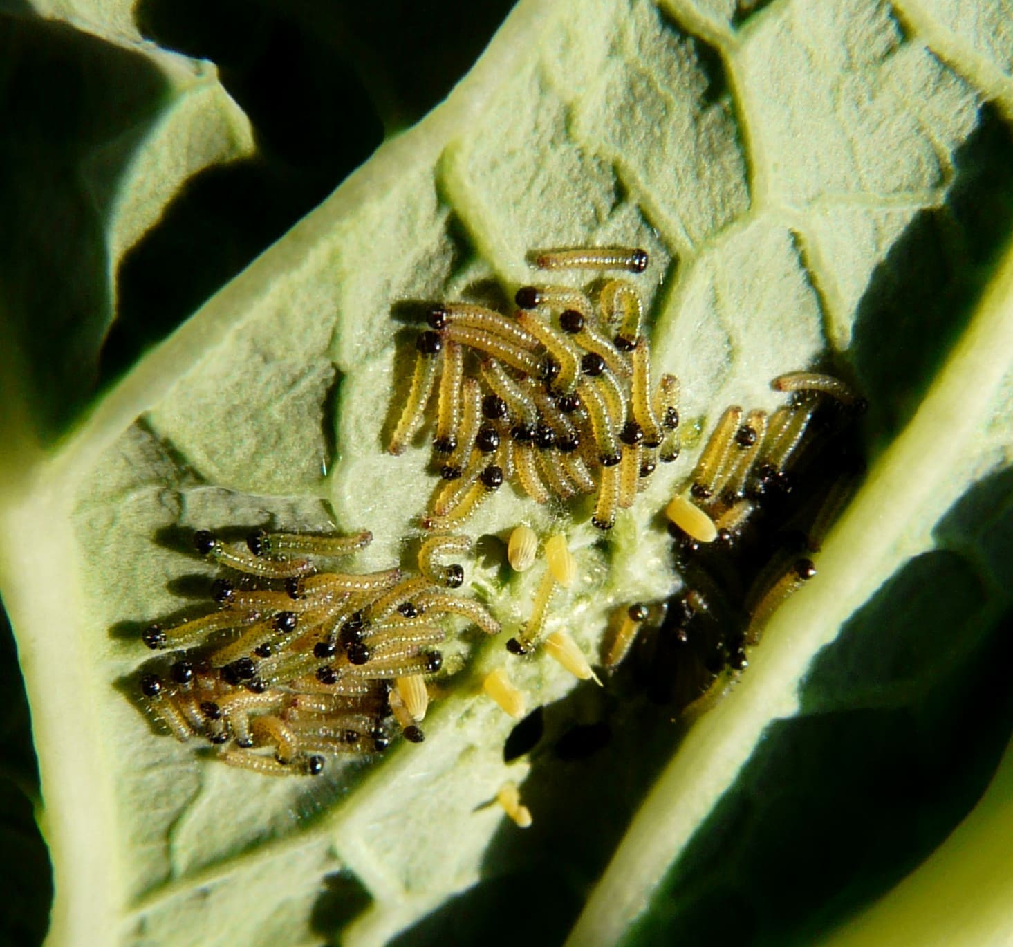 De ronde, donkergroene korrels zijn poepjes van de rupsen (geen eitjes) en moeten worden verwijderd. Door onderin de kooi keukenpapier te leggen, kun je dit makkelijk doen. Ook moeten de koolbladeren regelmatig ververst worden. Losse bladeren moeten dagelijks vervangen worden, planten in een vaas zodra ze verwelken en planten in een pot zodra ze kaalgevreten zijn. Verder mag de bak nooit in de volle zon staan: daar kunnen de rupsen niet tegen.