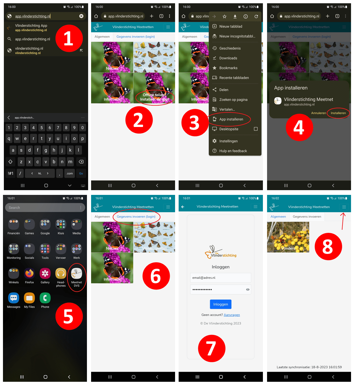- Navigeer in de Chrome-browser op de telefoon naar ‘app.vlinderstichting.nl’.