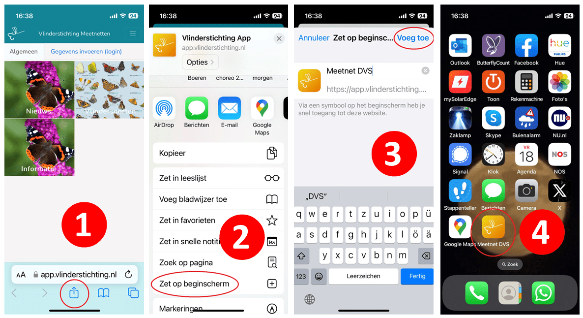 - Navigeer in de Safari-browser op de telefoon naar ‘app.vlinderstichting.nl’. Klik dan op het icoontje om te delen (vierkantje met pijltje naar boven).