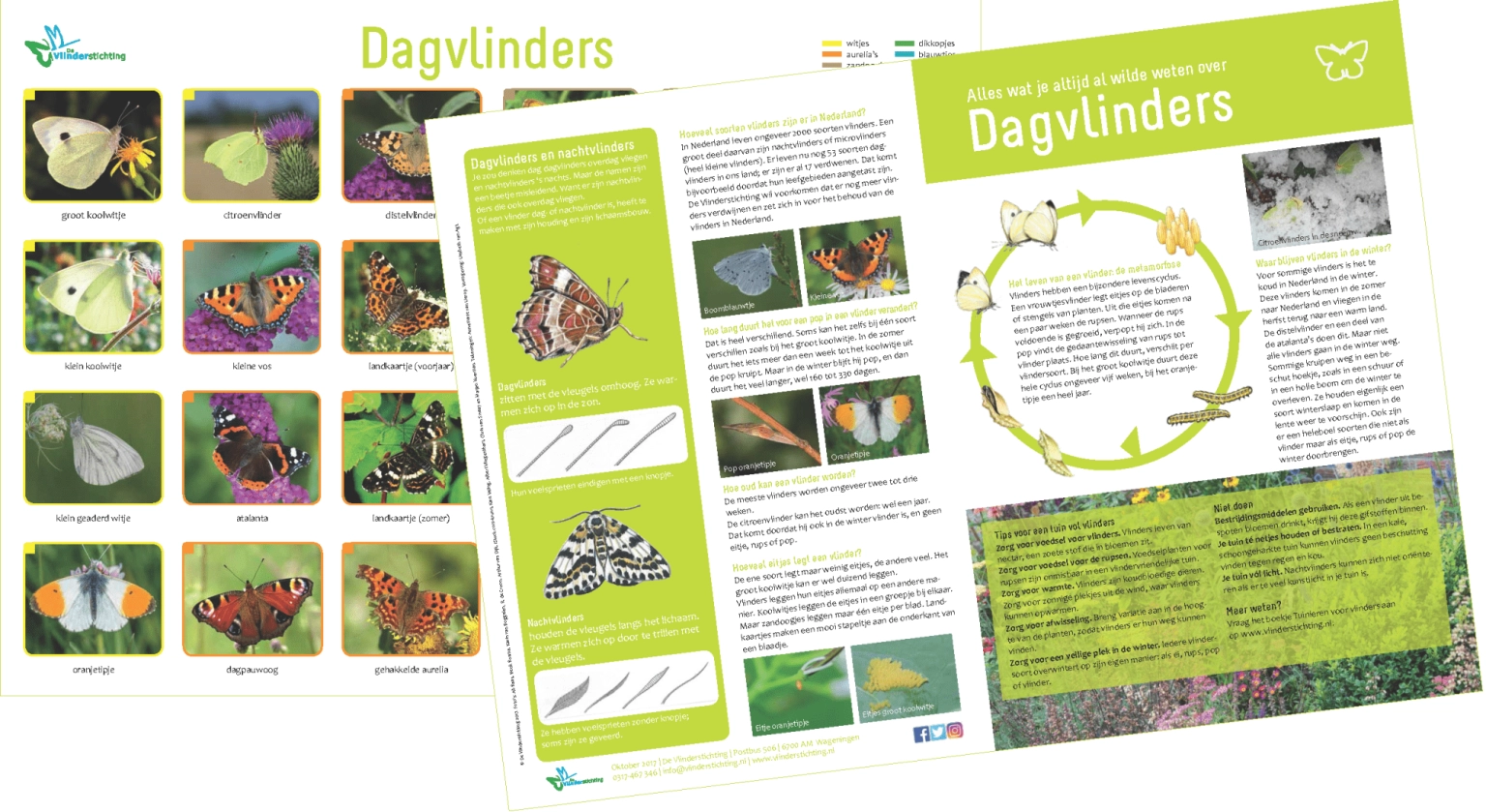 Een kleurrijke poster met informatie over en foto's van de 24 meest voorkomende dagvlindersoorten van Nederland. Afmeting 2xA4 gevouwen tot A4.