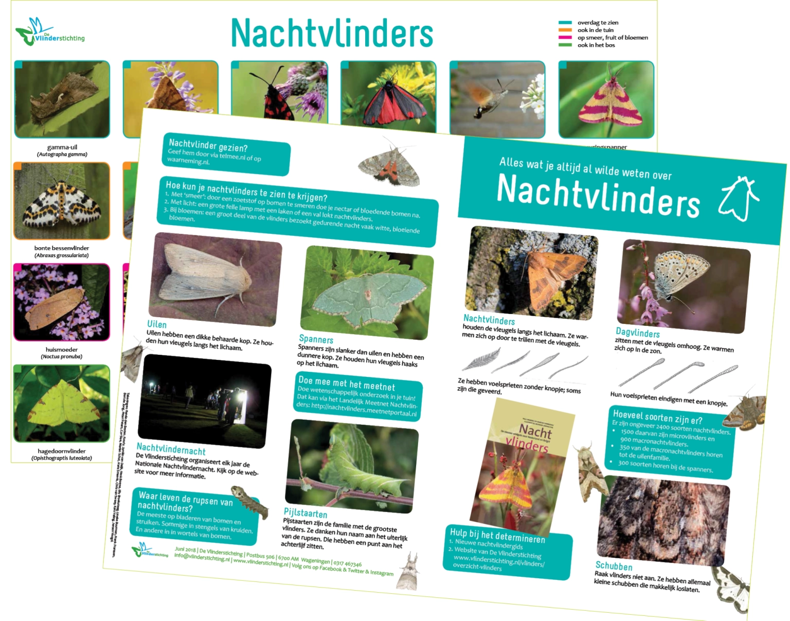 Een kleurrijke poster met informatie over en foto's van de 23 meest voorkomende nachtvlindersoorten van Nederland. Afmeting 2xA4 gevouwen tot A4.