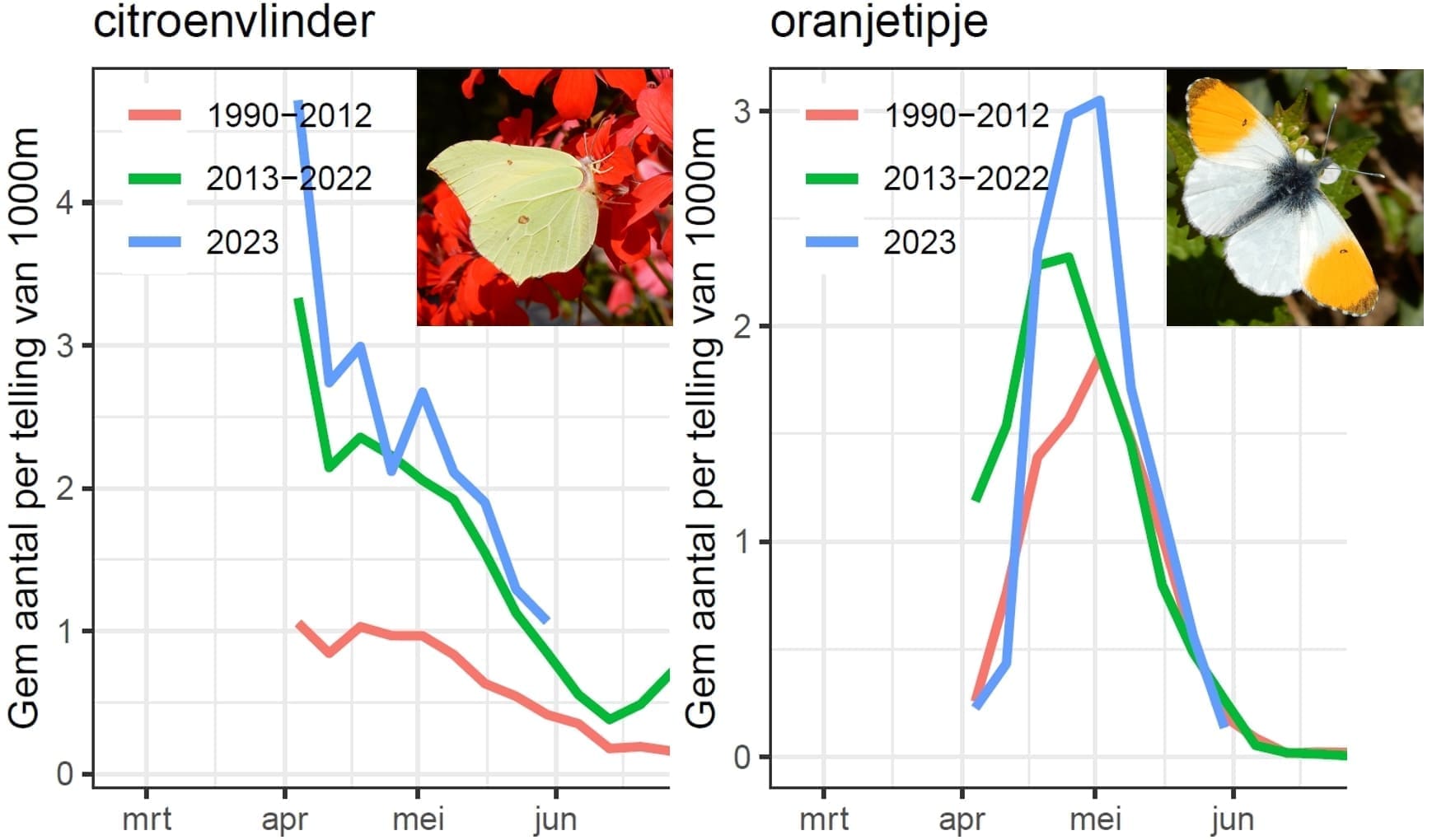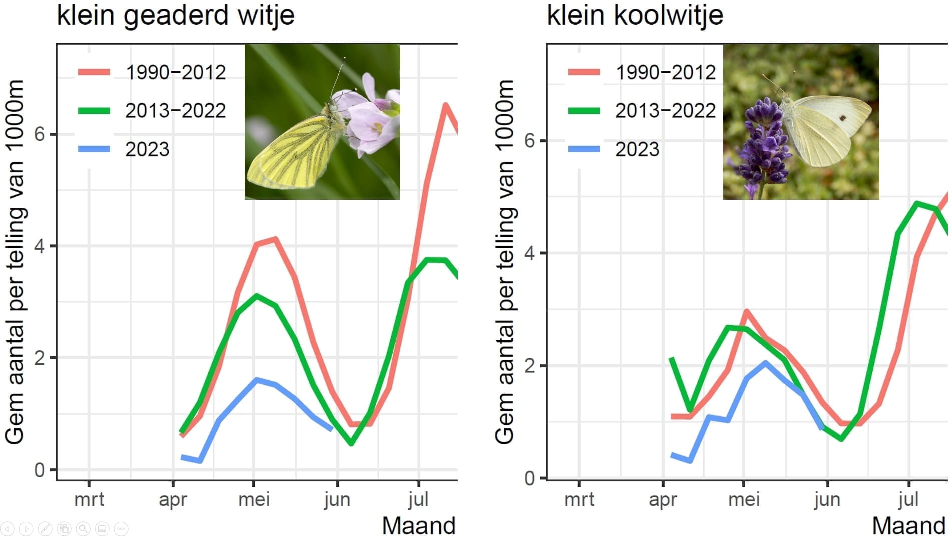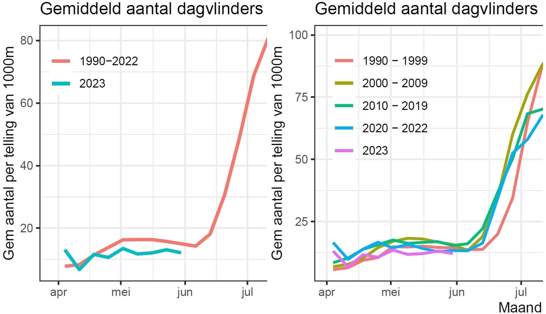 Kars’ tweet was gebaseerd op een anekdotische ervaring, maar gelukkig hebben we het meetnet vlinders, waar honderden tot jaarlijks meer dan duizend vaste routes wekelijks worden geteld op steeds dezelfde manier. Als we de gegevens van april en mei erbij halen zien we dat het aantal waargenomen vlinders in 2023 duidelijk onder het langjarige gemiddelde ligt en dat dit, vanaf 1990 toen het meetnet startte, tot nu toe, een van de slechtste vlinderjaren is. Toch deden niet alle vlinders het slecht dit voorjaar, want het oranjetipje en de citroenvlinder vlogen prima en er waren meer die gemiddeld of boven gemiddeld aanwezig waren. Maar soorten die normaliter het beeld bepalen in het voorjaar zoals klein geaderd witje, klein koolwitje, kleine vos, kleine vuurvlinder en landkaartje waren er veel minder. Als er in goede jaren 10 landkaartjes worden geteld in een route, dan waren het er dit voorjaar maar 2 of 3, een achteruitgang van 70-80%.