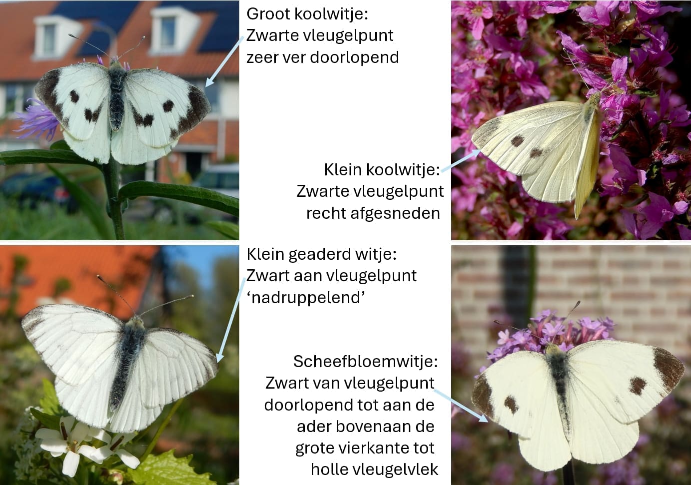 Het groot koolwitje is het gemakkelijkst te herkennen. De grote, zwarte vleugelpunten zijn heel kenmerkend en deze zijn zelfs bij een langsvliegende vlinder te zien. Het groot koolwitje is ook wel forser dan de andere drie witjes, maar grootte is wel een lastig kenmerk. Alleen als je ze naast elkaar ziet, is het evident, maar zelfs dan zijn er individuele verschillen. Zo kun je een flink klein koolwitje tegenkomen, maar ook een wat minder fors groot koolwitje. De zwarte tekening op de vleugelpunten is trouwens ook voor de andere soorten belangrijk voor de herkenning. Bij het klein koolwitje is het zwart op de vleugelpunt vrij beperkt en recht afgesneden. Bij het klein geaderd witje druppelt het wat na, met kleine zwarte vlekjes in de rand. Bij het scheefbloemwitje is er een uitgebreide grijszwarte tekening op de vleugelpunt, dat doorloopt tot aan de ader die naar de bovenkant van de zwarte vlek op de vleugel loopt.