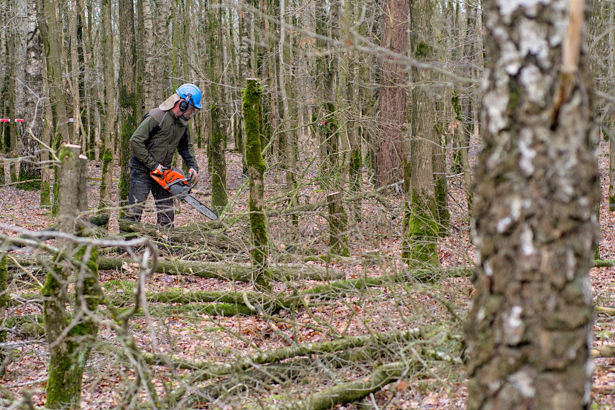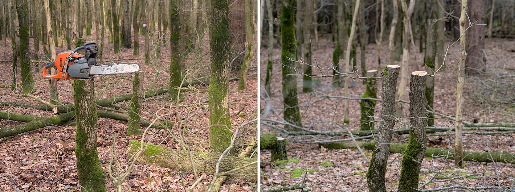 De zomereikjes zijn afgezet op een hoogte tussen 20cm en 180cm. We maken de snede waar mogelijk boven de eerste zijtakken, om de kans op uitlopen te vergroten. Met het beheer komt meer licht in het bos, en wordt het habitat geschikter voor bruine eikenpage.