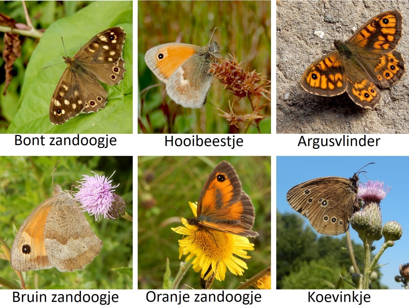 Nu is de tijd dat veel zandoogjes gaan vliegen. De drie talrijke soorten hebben maar één generatie per jaar en ontbreken in het voorjaar. Vanaf juni vliegen verspreid door Nederland wel zes verschillende zandoogjes en op heiden en in de duinen ook nog de heivlinder. Een aantal wordt nogal eens door elkaar gehaald en verkeerd gedetermineerd. Als je weet waarop te letten is dat niet nodig.