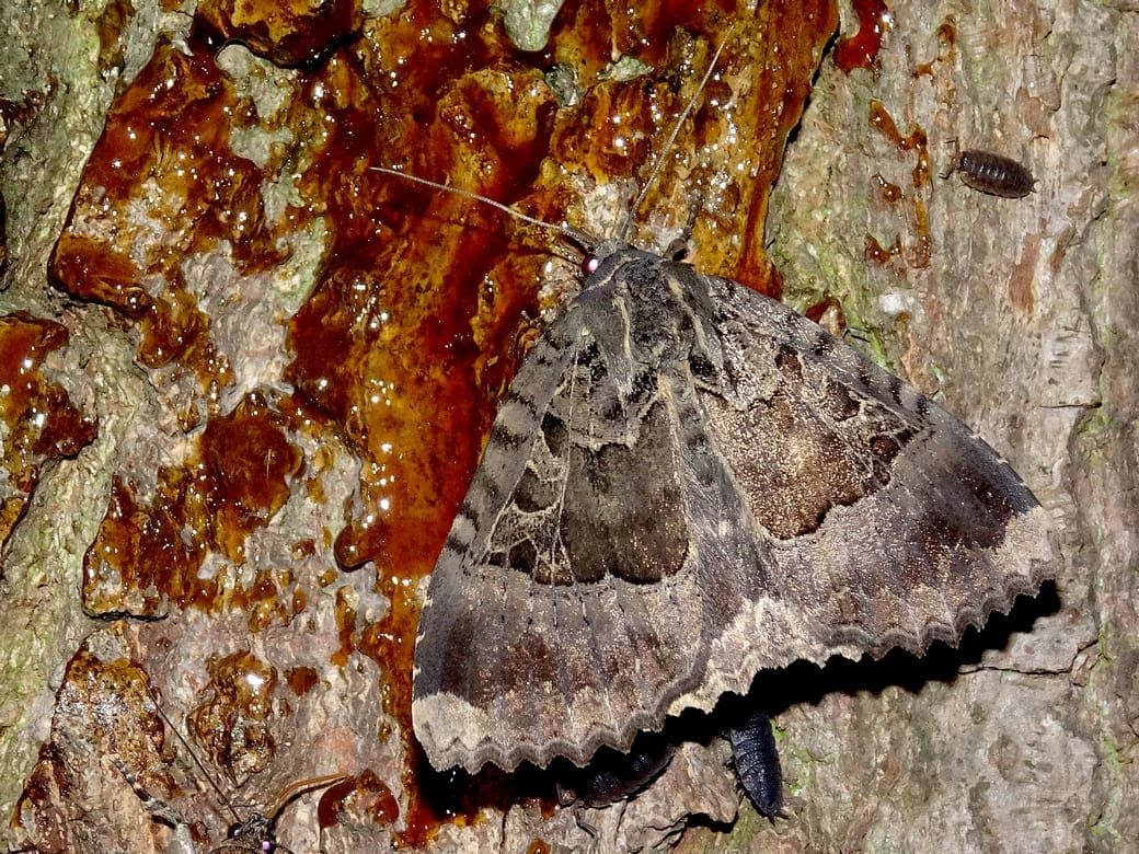 Stropen doe je met een mengsel van stroop, suiker, en naar keuze allerlei andere ingrediënten rond zonsondergang op bomen smeren. Een uurtje later zijn er nachtvlinders op afgekomen. Als je de plekken voorzichtig benadert en de zaklamp van onder naar boven rustig over de smeerplek laat schijnen, kun je de vlinders goed bekijken en op naam brengen. Onder aan dit bericht staat een recept voor het maken van smeer. Je kunt het trouwens ook nog simpeler doen en ook dat is vaak redelijk succesvol: gewoon rode wijn. Doe de wijn in een plantenspuit en stuif plekken op de bomen. Ook hier kun je dan na een uurtje nachtvlinders op verwachten. In de zomer zijn er een aantal grote, opvallende en algemene nachtvlinders die zich door de zoetigheid laten verleiden. De huismoeder is er daar een van. Deze komt in allerlei kleurvariëteiten voor van zeer lichtbruin tot bijna zwart. Kenmerkend is dat huismoeders de vleugels dicht op hun lijf hebben, waardoor ze heel langwerpig ogen en niet ‘driehoekig’ zoals veel andere uilen.