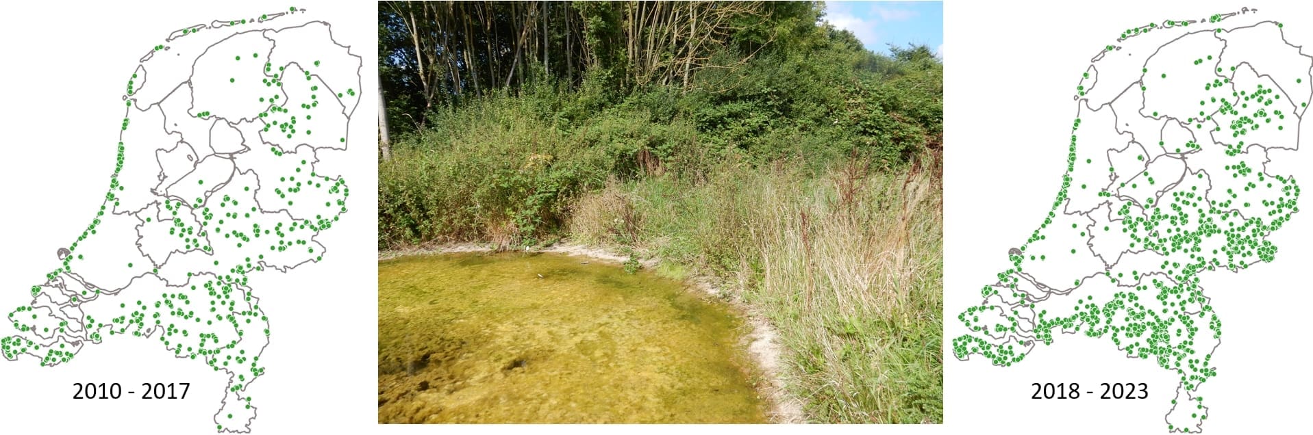In goede jaren zwerft de soort wat verder uit, buiten de duin- en heidegebieden. En dat is precies wat we in 2023 zagen gebeuren. Er werden opeens waarnemingen gedaan in alle delen van het land, behalve in veenweidegebieden en in het rivierengebied. Kijken we wat verder terug, dan zien we dat ook 2021 een heel goed jaar was waarin de soort aardig aan het zwerven ging. Ook valt op dat de zwervende pantserjuffer tot en met 2018 eigenlijk best wel schaars was. Daarna volgen jaren waarin hij zich steeds verder uitbreidt. Dit patroon past precies op dat van de zomerdroogte. Stel je even voor: in een droge zomer vallen veel plasjes uiteindelijk droog. Libellenlarven gaan dood, maar de eitjes van de zwervende pantserjuffer overleven. In het daaropvolgende voorjaar hebben de larven het rijk alleen. Geen last van andere libellenlarven die alle prooien opeten, of erger nog: die de kleine larven van de zwervende pantserjuffer zelf opeten. In het jaar na een droge zomer sluipen er dus meer zwervende pantserjuffers uit dan gemiddeld.