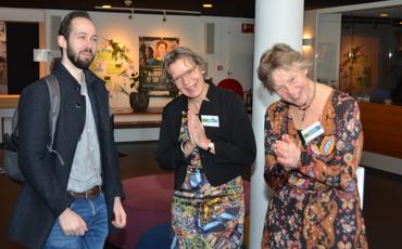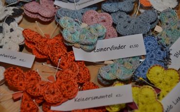 Rechts - In de laatste lezing riep Kars de aanwezigen op om op allerlei manieren een actieve bijdrage te leveren aan het werk van De Vlinderstichting. Linksboven - Op de infomarkt was van alles te koop, waaronder deze schattige gehaakte vlindertjes. Linksonder - De dag werd afgesloten met een gezellige borrel.