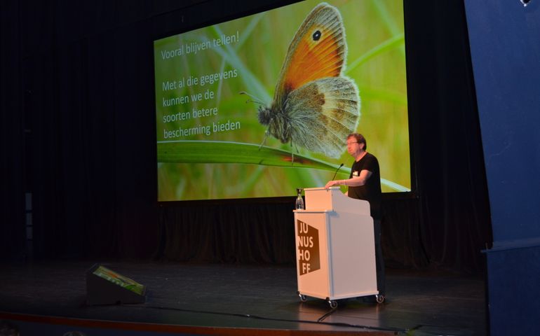 In het eerste blok werd duidelijk gemaakt door Albert Vliegenthart (links) hoe het met de vlinders gaat na tien jaar 10 voor 12! Vervolgens maakte Roy van Grunsven (rechtsboven) duidelijk wat de invloed daarop is van stikstof en Michiel Wallis de Vries legde uit wat we eraan doen om de situatie van vlinders te verbeteren.(rechtsonder). In de pauzes werden de informatie- en verkoopkramen druk bezocht.