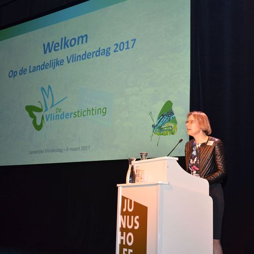 In het eerste blok werd duidelijk gemaakt door Albert Vliegenthart (links) hoe het met de vlinders gaat na tien jaar 10 voor 12! Vervolgens maakte Roy van Grunsven (rechtsboven) duidelijk wat de invloed daarop is van stikstof en Michiel Wallis de Vries legde uit wat we eraan doen om de situatie van vlinders te verbeteren.(rechtsonder). In de pauzes werden de informatie- en verkoopkramen druk bezocht.