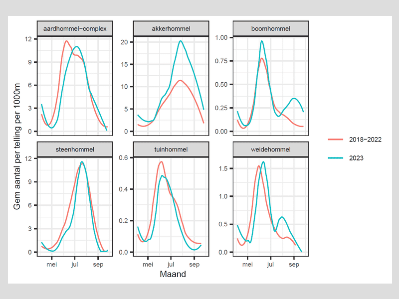 De vier andere algemene hommelsoorten: steenhommel, tuinhommel, weidehommel en aardhommelcomplex, laten allemaal de late stijging van de aantallen zien. Het duidelijkst zichtbaar was dit voor het aardhommelcomplex en de steenhommel. Het aardhommelcomplex en de steenhommel liepen in de eerste helft van het seizoen één tot twee weken achter op eerdere jaren. Hoewel de aantallen van het aardhommelcomplex in de zomer groter waren dan in 2022, is de verwachting dat 2023 een van de mindere jaren van het aardhommelcomplex was sinds de start van het meetnet. Ook de steenhommel bereikte weliswaar gemiddelde piekaantallen. Het vliegseizoen lijkt echter korter geweest dan normaal, dus de verwachting is dat het totale aantal steenhommels kleiner is.