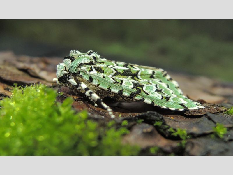 De lengte van de voorvleugel is een millimeter of twintig en de brede lichtgroene voorvleugel heeft een licht gebogen voorrand met een patroon van zwarte vlekken waarvan de meeste met wit zijn afgezet. Die zwarte vlekken variëren in grootte; soms zijn ze gereduceerd tot kleine losliggende vlekjes en boogjes, in andere gevallen zijn ze groot en vormen ze vooral in het middenveld een zwarte dwarsband.
