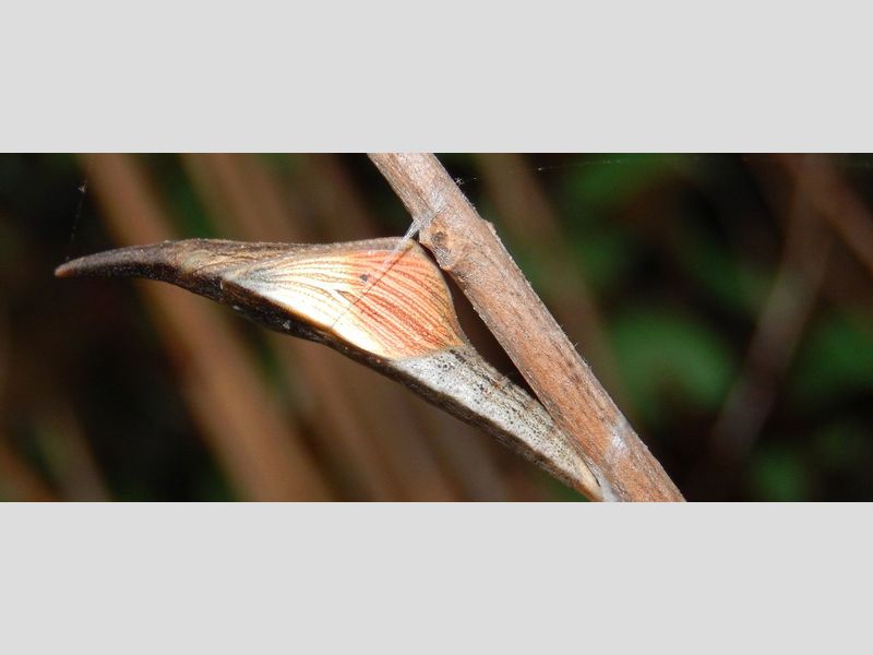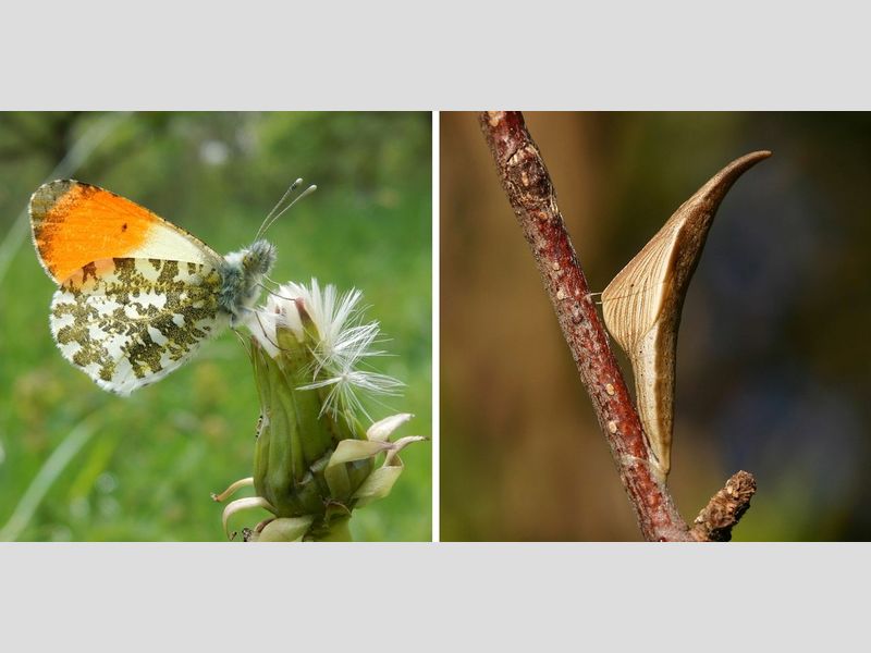 Een ander lid van de witjesfamilie is het oranjetipje en ook deze is nu als pop ergens in de plantengroei aanwezig. Dit is een echte voorjaarsvlinder die vliegt in april en de rupsen verpoppen al in juni. Dan gaan ze op zoek naar een plek waar ze veilig een maand of acht tot negen kunnen overleven. De graslanden waar ze als rups leven zullen in die tijd natuurlijk worden gemaaid of begraasd en daarmee zouden ook de poppen worden verwijderd. Vandaar dat de rupsen – om te verpoppen – bomen en struiken opzoeken, want die blijven meestal wel de winter overstaan. Op de leadfoto zien we de pop van het mannetje, met het oranje vleugeltipje al doorschemerend. Op de foto hieronder de pop van een vrouwtje, waar het oranje ontbreekt.