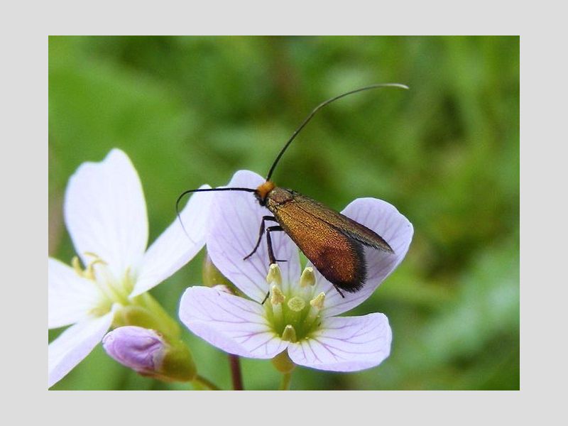 Als je nu in het voorjaar, bij het zoeken naar de oranjetipjes op de pinksterbloemen, goed oplet kun je ook de pinksterbloemlangsprietmot (Cauchas rufimitrella) tegenkomen. Dit is een heel algemene soort die door heel Nederland voorkomt, maar toch altijd leuk om te vinden. Ze zijn maar klein, met een spanwijdte van negen tot twaalf millimeter. Deze soort heeft echt lange sprieten. De sprieten van de mannetjes zijn tot wel twee keer zo groot als de lengte van de voorvleugel, die van de vrouwtjes zo’n anderhalf keer.