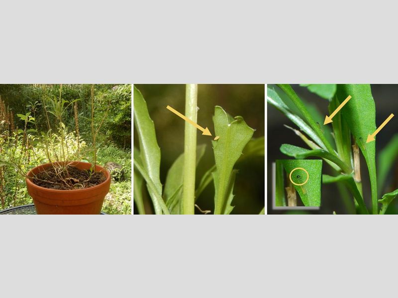 Het scheefbloemwitje lijkt zich echt vast in ons land te hebben gevestigd en we zijn benieuwd wat de belangrijkste waardplanten zijn. We willen daarom iedereen vragen dat als ze eitjes afgezet zien worden of rupsen vinden, dat door te geven met de plant waarop de vondst werd gedaan. De rups van het scheefbloemwitje is alleen als jonge rups goed herkenbaar. Het eerste en tweede stadium hebben een zwarte kop en dat is onmiskenbaar. Na de derde vervelling is de kop groen en dan is de rups niet meer te onderscheiden van die van het klein koolwitje.