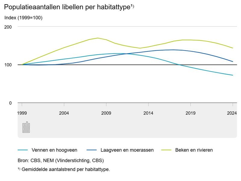 Libellen van laagveen en moerassen, zoals de gevlekte witsnuitlibel, namen aanvankelijk toe, maar zijn sinds 2018 met ruim 20 procent afgenomen. Wel liggen de aantallen libellen van dit leefgebied nog iets boven die van 1999. Libellen van stromend water, zoals de weidebeekjuffer, zijn over de hele periode toegenomen met 43 procent.