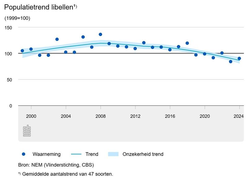 Tussen 2008 en 2024 zijn libellenpopulaties in Nederland gemiddeld met 28 procent afgenomen. Niet alleen zeldzame en kwetsbare soorten nemen in aantal af, maar ook de algemene soorten, zoals het lantaarntje. Sommige warmteminnende soorten, zoals de vuurlibel, profiteren van klimaatverandering en nemen gemiddeld juist toe. Dit blijkt uit nieuwe cijfers van het CBS en De Vlinderstichting.