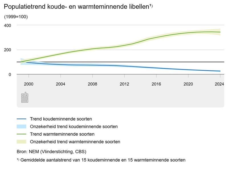 Warmteminnende soorten, zoals de vuurlibel en de zuidelijke keizerlibel, nemen als groep juist toe met gemiddeld 5 procent per jaar. Deze groei vlakt de laatste jaren enigszins af.