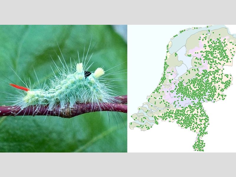 De rups van de meriansborstel is een zeer opvallende verschijning: groengeel met vier scheerkwasten op de rug en een mooie rode, opstekende staart. Het is ook zeker geen zeldzaamheid en juist nu, in het najaar, worden de rupsen veel gezien. Ook dit jaar zijn er alweer gemeld op Waarneming.nl en Telmee, en de komende weken zijn ze nog steeds te vinden. De meriansborstel (Calliteara pudibunda) is namelijk een algemene nachtvlindersoort die verspreid over het land voorkomt, met name op de zandgronden. De vlinder zelf vliegt in voorjaar en voorzomer, maar de vlinders zie je maar weinig omdat deze ’s nachts actief zijn. Wel worden ze regelmatig aangetroffen bij lichtvangsten met lamp en laken en in nachtvlindervallen en de zogenaamde LedEmmers. Ook op campings kun je ze vinden als je ’s ochtends vroeg bij de washokken komt waar de hele nacht het licht heeft gebrand.