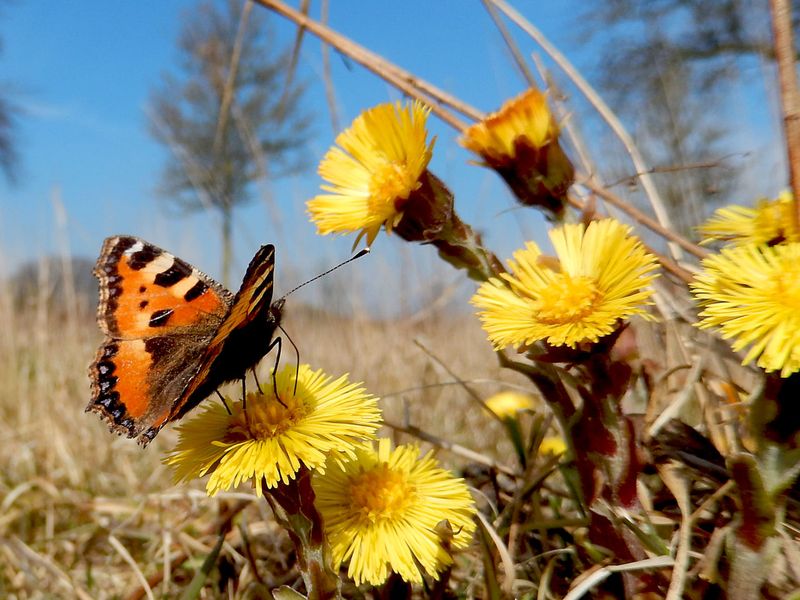 In het buitengebied is klein hoefblad de eerste wilde plant die flink gaat bloeien. Ook nu zijn de eerste gele bloemhoofdjes al weer gemeld en de eerste vlinders in het buitengebied zul je hierop kunnen aantreffen. Als het een poosje warm is geweest komen er meer planten in bloei en hebben de vlinders iets meer keus. Zo komen over een paar weken de wilgen in bloei en wat later ook sleedoorn. In tuinen kunnen we zelf actief zorgen voor voldoende vlindervoedsel. Er zijn heel wat plantensoorten die al in februari en maart volop bloeien en nectar leveren. Dat gaat deels om inheemse, hier thuishorende planten zoals speenkruid, hondsdraf en paarse dovenetel. Maar er zijn ook veel geschikte (uitheemse) tuinplanten. In veel tuinen zien we winterheide bloeien. Dit is geen inheemse soort (onze heide bloeit pas in juli), maar in tuinen is het wel een prima nectarplant. Ook sneeuwbal (Viburnum) geeft voedsel en wordt gebruikt door de vlinders. Ook de vroege bollen, zoals krokus, blauwe druifjes en Scilla (sterhyacint) kunnen door vlinders worden gebruikt, maar hierin zit niet heel veel nectar en als ze alternatieven hebben zul je ze er niet veel op aantreffen. Ook maagdenpalm, die veel als bodembedekker wordt gebruikt bloeit zeer langdurig en wordt momenteel gebruikt.