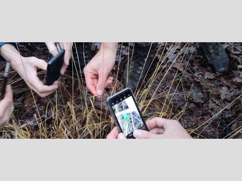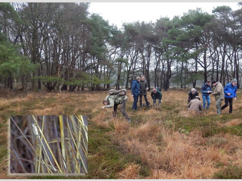 Na dit intermezzo gingen we lekker het veld in op zoek naar vlinders en libellen. Aangezien het midden december is verwacht je niet zoveel, maar als je weet wat en hoe je moet zoeken is er wel degelijk van alles te beleven. Zo ging er een groep met Menno Venema (De Vlinderstichting) op pad om de eitjes van de sleedoornpage te zoeken. Deze zeldzame vlinder komt maar op één plek in Drenthe voor en dat is in Zuidwolde. Het kostte flink wat zoekwerk, maar uiteindelijk werden twee eitjes gevonden.