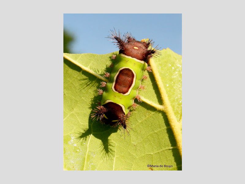 De veelkleurige vlinderrups zat op de bladeren van een pas aangeschafte exotische kamerplant die in de woonkamer van de familie Everaerts stond. De opvallende vorm en tekening van de rups trok meteen de aandacht van de vrouw des huizes. De tot 2 cm grote rups van Acharia stimulea is dan ook opvallend herkenbaar. Zowel aan de kop als aan het staartuiteinde heeft ze opvallende uitsteeksels, die bezet zijn met netelharen. Nog opvallender is de kleur: een bruine rups die een wit-groen jasje lijkt aan te hebben. De Engelse naam ‘Saddleback caterpillar’ (‘zadelrups’) is sprekend. Het beestje lijkt overigens geen poten te hebben: een kenmerk van de nachtvlinderfamilie van de slakrupsen, waarvan in Vlaanderen twee (onschuldige) vertegenwoordigers voorkomen.