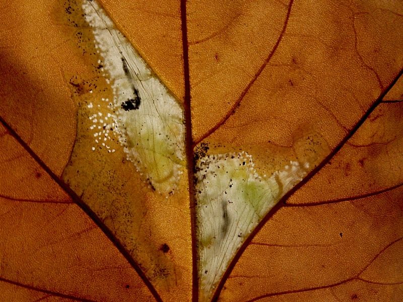 De vlinders zijn in rusthouding slechts 4 – 5 mm. groot en van een bijna overdreven pracht: warm oker met blinkend zilveren tekening. De plataanvouwmijnmot komt in geheel Nederland voor (zie hier het verspreidingskaartje), eigenlijk overal waar platanen te vinden zijn. Het is in Nederland een relatieve nieuwkomer, die in minder dan een halve eeuw ons land vanuit het zuidoosten naar het noordwesten heeft gekoloniseerd. Het is bekend, dat kolonisten in de beginjaren in grote aantallen kunnen voorkomen, waarna de aantallen teruglopen. Er zijn aanwijzingen, dat dit laatste ook bij de plataanvouwmijnmot het geval is. In Nederland vliegt de plataanvouwmijnmot in drie generaties. Mijnen van de zomer- en najaarsgeneratie zijn veel groter dan voorjaarsmijnen, omdat bladeren later in het seizoen minder voedsel bevatten, en de larve daarom meer moet eten (www.bladmineerders.nl). De poppen van de derde generatie zitten nu in de afgevallen bladeren waarin je de mijnen vindt. Hou ze maar eens tegen het licht!