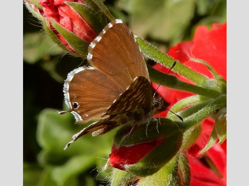 Vorige week is dit mooie kleine blauwtje weer gezien in ons land. Hylke Tromp ontdekte er een in Giessenburg (Zuid-Holland). De vlinder, een vrouwtje, verbleef geruime tijd in de tuin en was zelfs bezig eitjes af te zetten. Ook hier zouden dus, over een week of vier, weer verse geraniumblauwtjes kunnen vliegen. Ook zouden er uit Zuid-Europa nieuwe vlinders kunnen verschijnen als er weer een warme periode komt met veel zuidenwind. Het voorkomen van het geraniumblauwtje lijkt nog erg incidenteel te zijn. We zien geen duidelijke toename van het aantal waarnemingen, maar afhankelijk van de weersomstandigheden en waarschijnlijk ook omdat ze soms ‘meegelift’ hier aankomen lijkt het nog vrij toevalsafhankelijk. Het geraniumblauwtje is onopvallend, klein en bruin, maar de tekening is wel uniek en als je hem ziet zitten zie je onmiddellijk dat je met iets bijzonders te maken hebt. We zijn benieuwd of er nog meer zullen worden gezien.