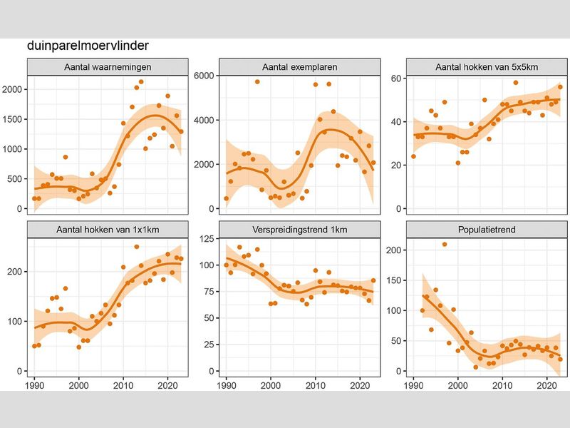 Tot we naar de laatste twee grafieken kijken: zowel de verspreidingstrend als de populatietrend dalen. Volgens ons Meetnet Vlinders daalt het aantal vlinders zelfs fors, en zijn er nu iets van 75 procent minder dan in 1992 (en zelfs bijna 90 procent minder dan in 1997). Dat klinkt ineens als een heel ander verhaal; het gaat helemaal niet goed met de duinparelmoervlinder.