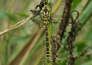 De blauwe glazenmaker is een opvallend gekleurde libel. De mannetjes (foto boven) zijn blauw met geel en de vrouwtjes (foto links) voornamelijk groen met donkere vlekken. Glazenmakers zijn ongevaarlijk en steken of bijten niet. Blauwe glazenmakers kunnen soms tot ver in de schemering jagen. Zelfs als het al bijna donker is zie je ze nog vlak boven de bodem rondvliegen op zoek naar insecten. Vooral de komende weken zijn ze volop aan te treffen, ook bij u in de tuin of het parkje op de hoek!