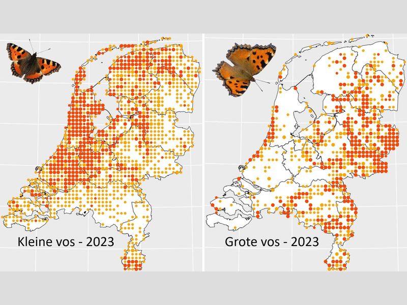 De kleine vos doet het al jaren erg slecht, vooral op de hogere zandgronden in het oosten en zuiden van ons land. In het westen en noorden zijn ze nog redelijk veel aanwezig. Als we kijken naar het verspreidingskaartje van de kleine vos van vorig jaar (2023), dan zien we dat er hele gebieden zijn waar deze vlinder niet is gemeld. En dat gaat niet om één of twee vierkante kilometer, maar er zijn gebieden van 150 tot 200 vierkante kilometer waar het hele jaar geen enkele kleine vos is gemeld. En we weten dat er zeer veel waarnemers zijn die hun gegevens doorgeven en we weten ook dat de ‘lege’ gebieden van de kleine vos zeker goed zijn onderzocht.