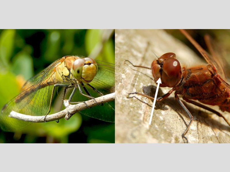 Zo laat in het seizoen zijn er niet veel libellen meer. Heidelibellen nog wel. De bruinrode en steenrode heidelibel blijven tot de eerste forse nachtvorst te zien. Voor het onderscheid let je op de hangsnor.