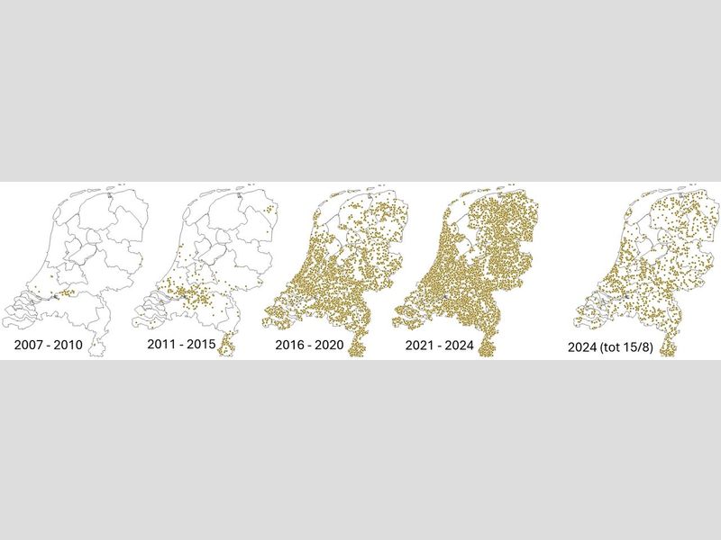 Na een paar jaar bleken er wel snelle leerlingen te zijn en (kool)mezen, kauwen, mussen en ook muizen bleken de rupsen te eten. Toch komt de buxusmot nu nog steeds in het hele land voor en lijkt zich redelijk te kunnen handhaven, ondanks het feit dat op veel plekken de buxushaagjes en struiken zijn vervangen door andere soorten. In kweeksituatie bleken de rupsen ook andere planten te kunnen eten, maar daarvan zijn nog geen meldingen ‘uit het wild’. Ook dit jaar, 2024, is de buxusmot al uit het hele land gemeld, maar de piek van de activiteit ligt in september. De komende weken zal dus blijken of de soort nog steeds toeneemt in aantal of dat er al een afvlakking te zien is. We vragen iedereen die een buxusmot, of rupsen ervan, tegenkomt om de waarnemingen door te geven via Waarneming.nl of via de NDFF invoerapp Telmee. Nog veel waardevoller is het als men meedoet aan het meetnet nachtvlinders, zodat we nog beter de vinger aan de pols kunnen houden.