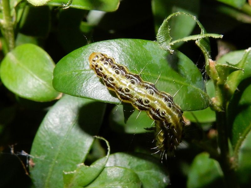 De buxusmot is een heel fraaie nachtvlinder. De normale vorm is wit, met een prachtige parelmoerglans en een vage blauwtint. De rand is donker gekleurd. Er is ook een bruine vorm, maar die komt veel minder voor dan de wit met zwarte. Hoewel hij dus wel heel mooi is, is de buxusmot toch niet erg geliefd. Zeker liefhebbers van buxus hebben een bloedhekel aan de vlinder, of eigenlijk vooral de rups. De rupsen zitten vaak met veel bij elkaar en eten buxusstruiken in een mum van tijd helemaal kaal. De uitbreiding van deze exoot, die afkomstig is uit Japan, kon zo snel verlopen omdat de natuurlijke vijanden, die hij in Oost Azië wel heeft, hier niet voorkomen. Onze inheemse predatoren hadden deze nieuweling nog niet in de gaten en wisten nog niet dat die rupsen eetbaar waren.