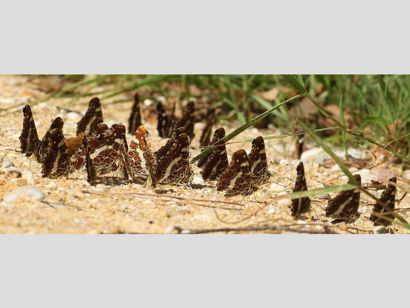 Het gedrag dat vlinders in grote ‘drinkgezelschappen’ op vochtige paden of op uitwerpselen zitten is wel bekend uit het buitenland. In Engeland noemen ze het mud-puddling en Rob de Jong, die hier een film over heeft gemaakt introduceerde een Nederlandse term voor dit gedrag: poedelen. Met name in warme bergachtige streken is dit een veel voorkomend fenomeen. Het gaat daarbij meestal om blauwtjes, maar ook van andere soorten is dit gedrag bekend. De reden voor die gezelschappen en het drinken op die natte plekken en drollen is niet helemaal duidelijk. Het gaat de vlinders vast en zeker om mineralen en meestal zijn het alleen mannetjes die poedelen. Bij de landkaartjes in de Meinweg is nog niet gecontroleerd op geslacht. De derde generatie van het landkaartje vliegt nu al enkele weken, en lijkt het bijzonder goed te doen. Er worden veel landkaartjes gezien verspreid over het land, maar niet zoveel bij elkaar als hier door Marlie.