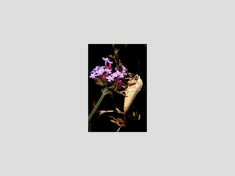 Het is bekend dat ijzerhard (Verbena) overdag de nodige dagvlinders aantrekt. Maar ook ’s avonds is een bezoekje aan deze plant aan te raden, want ook nachtvlinders komen af op de nectar van deze plant, zeker nu er niet veel andere planten meer bloeien.
