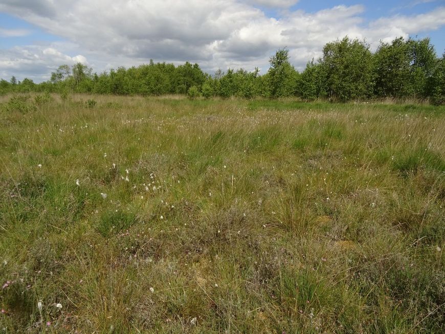 Eenarig wollegras is hier in de vochtige en natte delen volop te vinden. De natste stukken zijn te dynamisch en daar zouden de rupsen ’s winters waarschijnlijk verdrinken. Hogerop vonden we de waardplant wel samen met nectarbron dophei, maar de hoogveensoorten ontbraken dan weer. Nader onderzoek aan zowel bodem als waterhuishouding gaf de verklaring: de resterende veenlaag vernat in de winter snel genoeg om eenarig wollegras te laten floreren, maar in de zomer zakt het waterpeil te diep weg (60 tot 80 centimeter), waardoor hoogveensoorten geen kans maken. Ook voor de rupsen van het veenhooibeestje wordt het te droog. De veenwaterstand blijkt hier nog sterk mee te bewegen met de grondwaterstand in de wijde omgeving. Dit gold ook voor de plekken met veel eenarig wollegras in het Schoonebeekerveld, hoewel daar binnen de vernatte compartimenten wel kansrijke ontwikkelingen voor de toekomst op gang komen.
