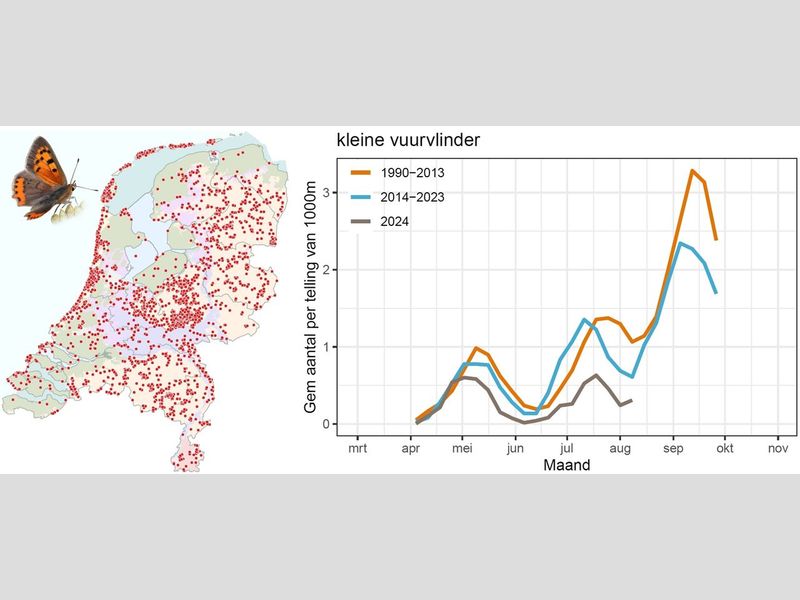 De kleine vuurvlinder is een algemene vlinder die overal in ons land voorkomt. Dit jaar zijn de aantallen van de kleine vuurvlinder vooralsnog laag. Mogelijk kan de derde septembergeneratie daar verandering in brengen. Vaak is deze generatie de grootste. Vanaf half augustus verschijnen de vuurvlinders van de derde generatie. De komende weken zal blijken of herstel optreedt.