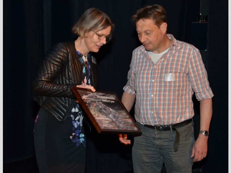 Hij moest die dag werken, maar met list en bedrog was hij naar Wageningen gelokt (collega's bij PWN, bedankt!) zodat hij de onderscheiding ter plekke in ontvangst kon nemen uit handen van directeur Titia Wolterbeek.