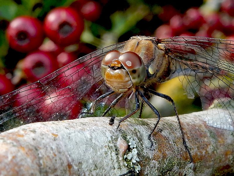 Aan de kleuren in de naam van de heidelibellen moeten we trouwens niet veel waarde hechten, want de kleur varieert sterk met geslacht en leeftijd. Jonge dieren zijn bruingeel van kleur en de mannetjes worden rood als ze geslachtsrijp worden. In de loop van de tijd wordt de kleur donkerder en nu, zo laat in het jaar, zijn ook de vrouwtjes donkerbruin tot zelfs roodachtig. De bloedrode heidelibel is goed te herkennen aan de geheel zwarte poten. De andere twee hebben gele of bruine strepen langs de poten. De steenrode heidelibel is te herkennen aan de hangsnor. Bovenop hun snuit hebben alle heidelibellen een zwart vlekje, als een soort van snorretje. Bij de steenrode heidelibel loopt het zwart langs de rand omlaag, waardoor de snor een hangsnor wordt. Bij de bruinrode ontbreekt dit en die heeft dus alleen het zwarte snorretje bovenop. Let er maar eens op en als je ze in je tuin ziet geef dit dan door via de Jaarrond tuintelling.