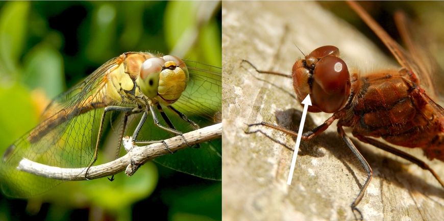 Verschil tussen bruinrode (links) en steenrode heidelibel (rechts) is de hangsnor (foto: Kars Veling) Verschil tussen bruinrode (links) en steenrode heidelibel (rechts) is de hangsnor (foto: Kars Veling)