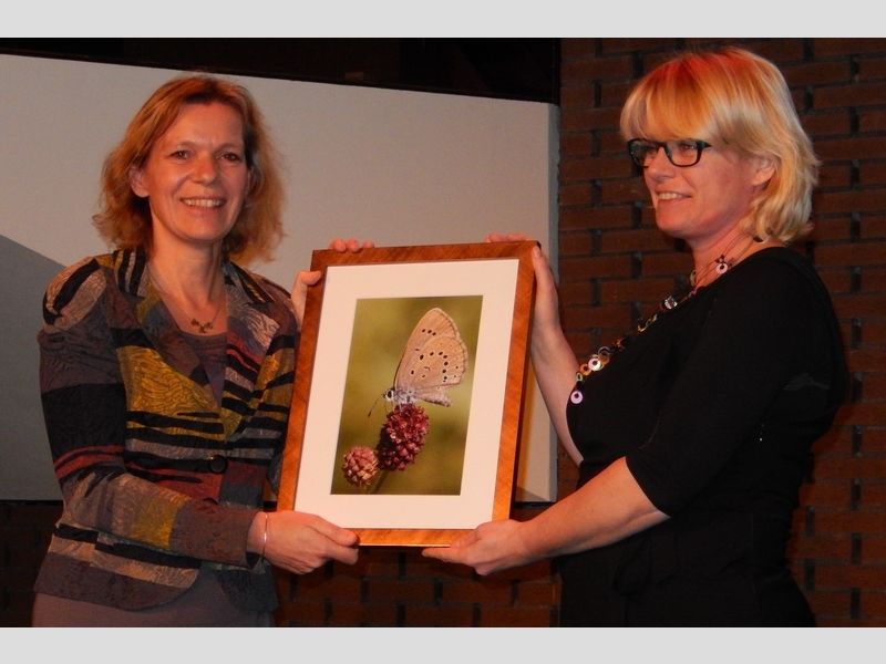Van de samenwerkende soortenbeschermingsorganisaties in Nederland kreeg de provincie een cadeau voor de ‘unieke prestaties’ op het gebied van biodiversiteit. Voorzitter Titia Wolterbeek van de Vlinderstichting zei blij te zijn met de voortdurende aandacht die Noord-Brabant, ook in tijden van bezuinigingen, besteedt aan de bescherming van plant- en diersoorten. 'Zo'n symposium als vandaag, dat kan ook alleen maar in Brabant' aldus Wolterbeek, voordat ze een fotoportret van een pimpernelblauwtje overhandigde aan Yolande van der Meulen, directeur Ecologie van de provincie.