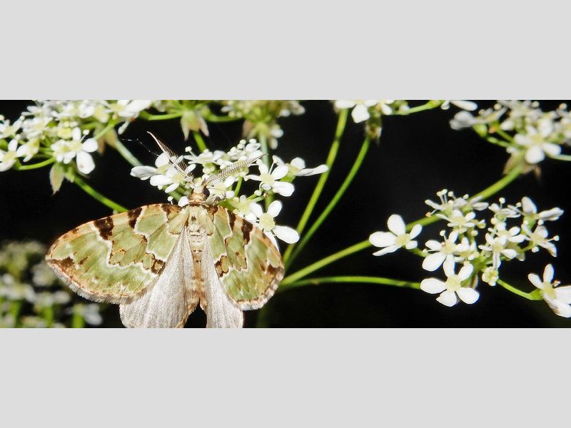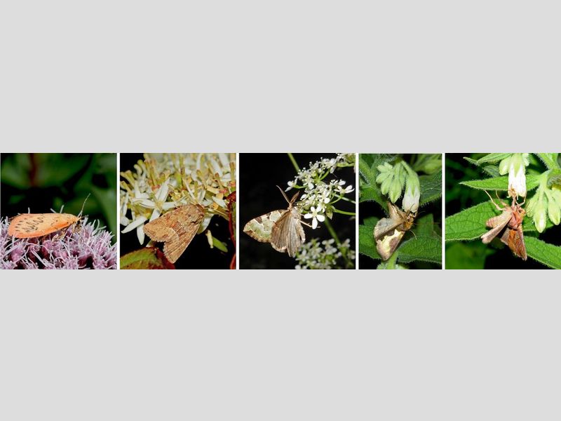 Motten op bloemen: v.l.n.r. rozenblaadje op koninginnenkruid; oranjegeel halmuiltje op kornoelje; kleine groenbandspanner op fluitenkruid; koperuil en goudvenstertje, beide op smeerwortel. Motten op bloemen: v.l.n.r. rozenblaadje op koninginnenkruid; oranjegeel halmuiltje op kornoelje; kleine groenbandspanner op fluitenkruid; koperuil en goudvenstertje, beide op smeerwortel.