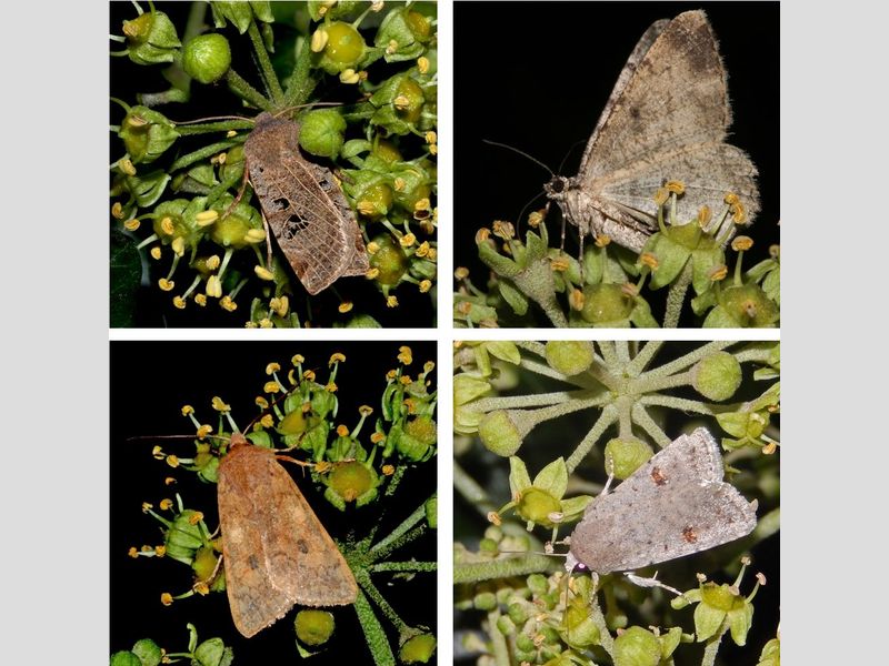 Nachtvlinders op klimop: v.l.n.r. boven zwartvlekwinteeruil en taxusspikkelspanner, onder bruine herfstuil en kadeni-stofuil. Nachtvlinders op klimop: v.l.n.r. boven zwartvlekwinteeruil en taxusspikkelspanner, onder bruine herfstuil en kadeni-stofuil.