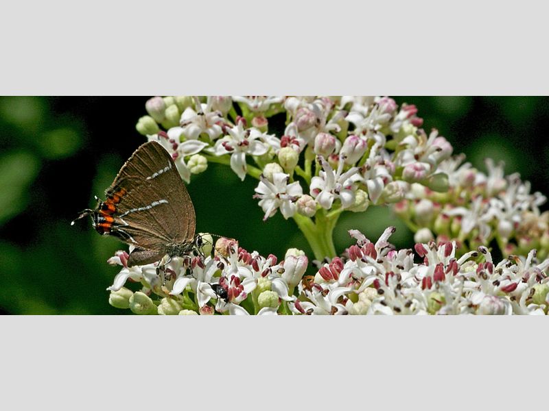 De vrouwtjes komen soms naar beneden om nectar te drinken, zoals hier op kruidvlier (Bron: Kars Veling) De vrouwtjes komen soms naar beneden om nectar te drinken, zoals hier op kruidvlier (Bron: Kars Veling)