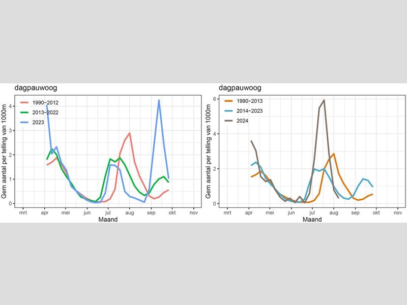 In de meeste jaren kiezen dagpauwogen voor de eerste strategie (vroeg in rust gaan). Dan zie je in de nazomer alleen overwinteraars, die af en toe tevoorschijn komen om te drinken. Vorig jaar, in 2023, was er echter ook een grote extra generatie eind augustus en begin september. Die was zelfs veel groter dan de zomergeneratie in dat jaar. In 2024 was er juist een erg grote zomergeneratie, en het is boeiend om te zien of er nu een nog groter aantal dagpauwogen zal rondvliegen in september.